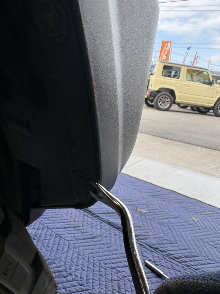 フェンダーライナーも切り離していきます。フェンダー先端のところの10mmのネジとクリップ3つを外します。