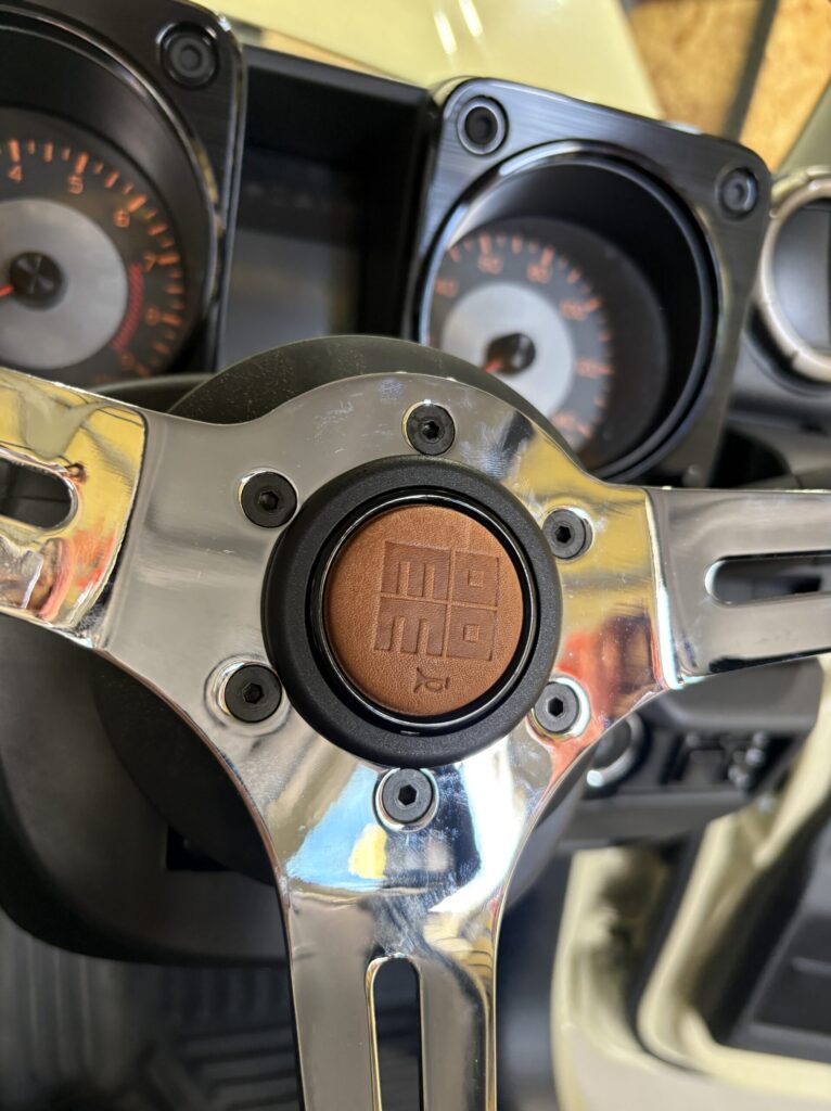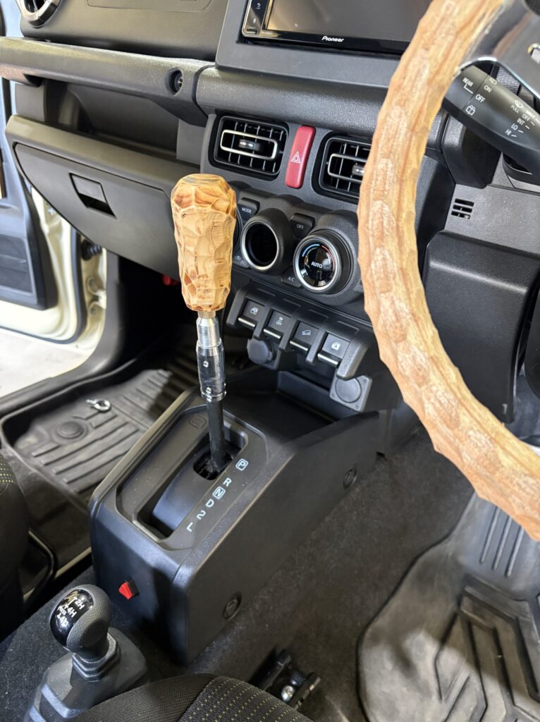 そして、JB64/JB74ではあまり例がないミッション用シフトノブを使うために、オーバードライブスイッチを移動してプッシュ式シフトノブにして、こちらも木材を加工したシフトノブに変更!