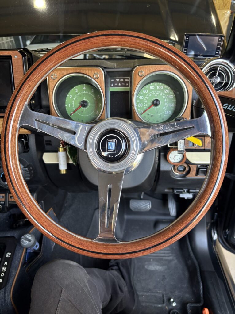 ハンドル交換を依頼されるジムニーは皆さん個性的なカスタムをされてることが多いのでワクワクして待っていると…